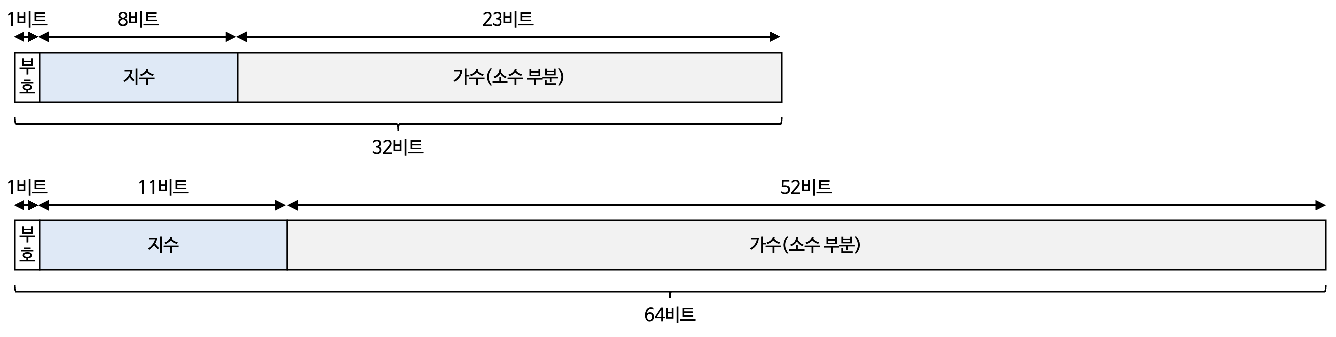- $2^{지수}\ \times \ 1.\_\_\_$형태의 소수를 저장할 때 지수와 ___에 해당하는 소수 부분(fraction)만 저장