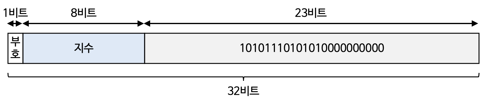 - 부동 소수점 : 소수점이 고정되어 있지 않은 소수 표현 방식
