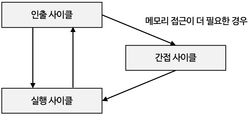 - 간접 사이클(indirect cycle) : 명령어를 실행하기 위해 한 번 더 메모리에 접근하는 단계
