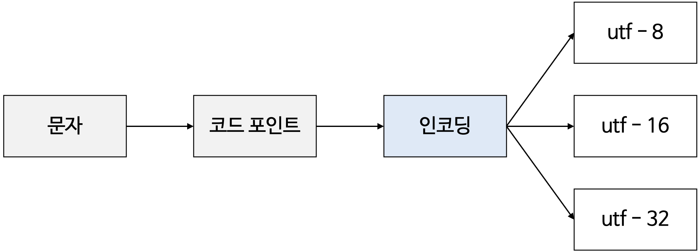 - 유니코드 문자에 부여된 값을 인코딩하는 방식 : UTF-8, UTF-16, UTF-32 → 가변 길이 인코딩