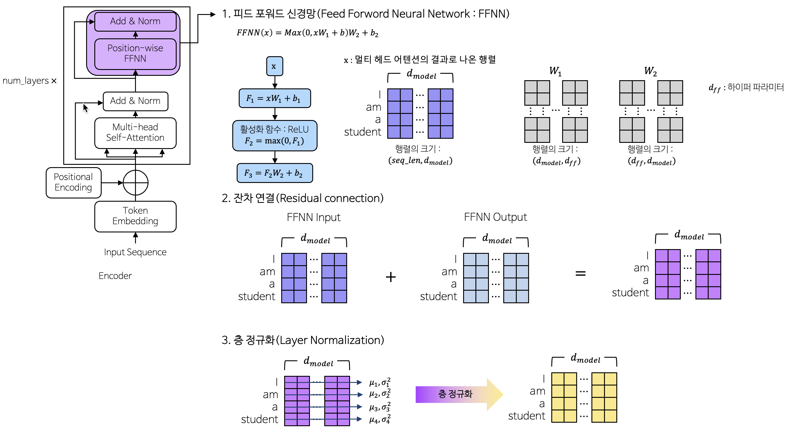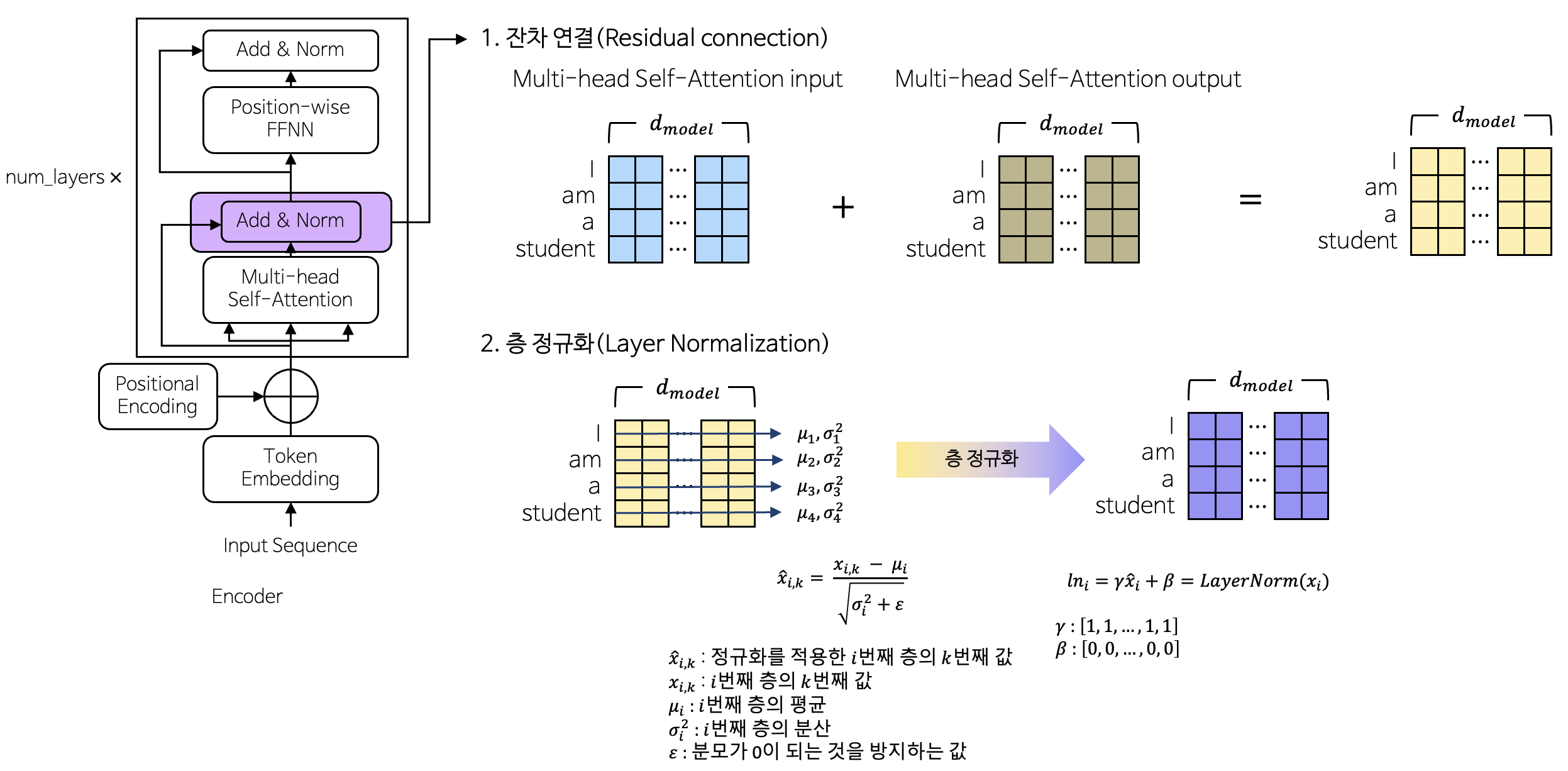 - 잔차연결(Residual Connection) & 정규화(Layer Normalization)